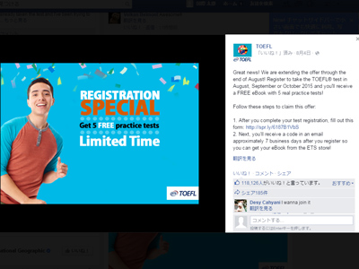 2012年に立ち上げられたこのFacebookページは、現在160万人以上の方が“いいね!”をしてTOEFLテスト対策に役立てています。今までご存知なかった方も是非この機会にご活用ください。