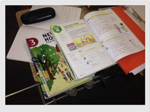 授業の最初の5分間に、Reading Timeとして音読活動を実施。1年生の教科書の始めから、ユニットごとに読んだ回数をチェックシートに記入し100回読み終わったら提出。1年生から3年生までの教科書を合本にして1冊にして使用。1冊にまとめることで、音読以外の活動でも効果的に使うことができます。