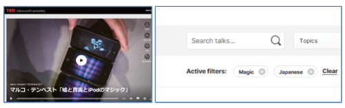 ビデオ選びについて、私の例をご紹介しましょう。私の趣味の一つにマジックがあります。そこで、自分の興味や関心に合ったトピックはないかと探してみると、3つのiPodをマジックの小道具として利用した、嘘と真実、芸術と感情についてのプレゼンテーションを見つけました。動画再生時間も5分以内でした。検索方法ですが、Search talksにmagicとキーワードを入力するとマジックに関連のありそうなプレゼンテーションがいくつか表示されます。